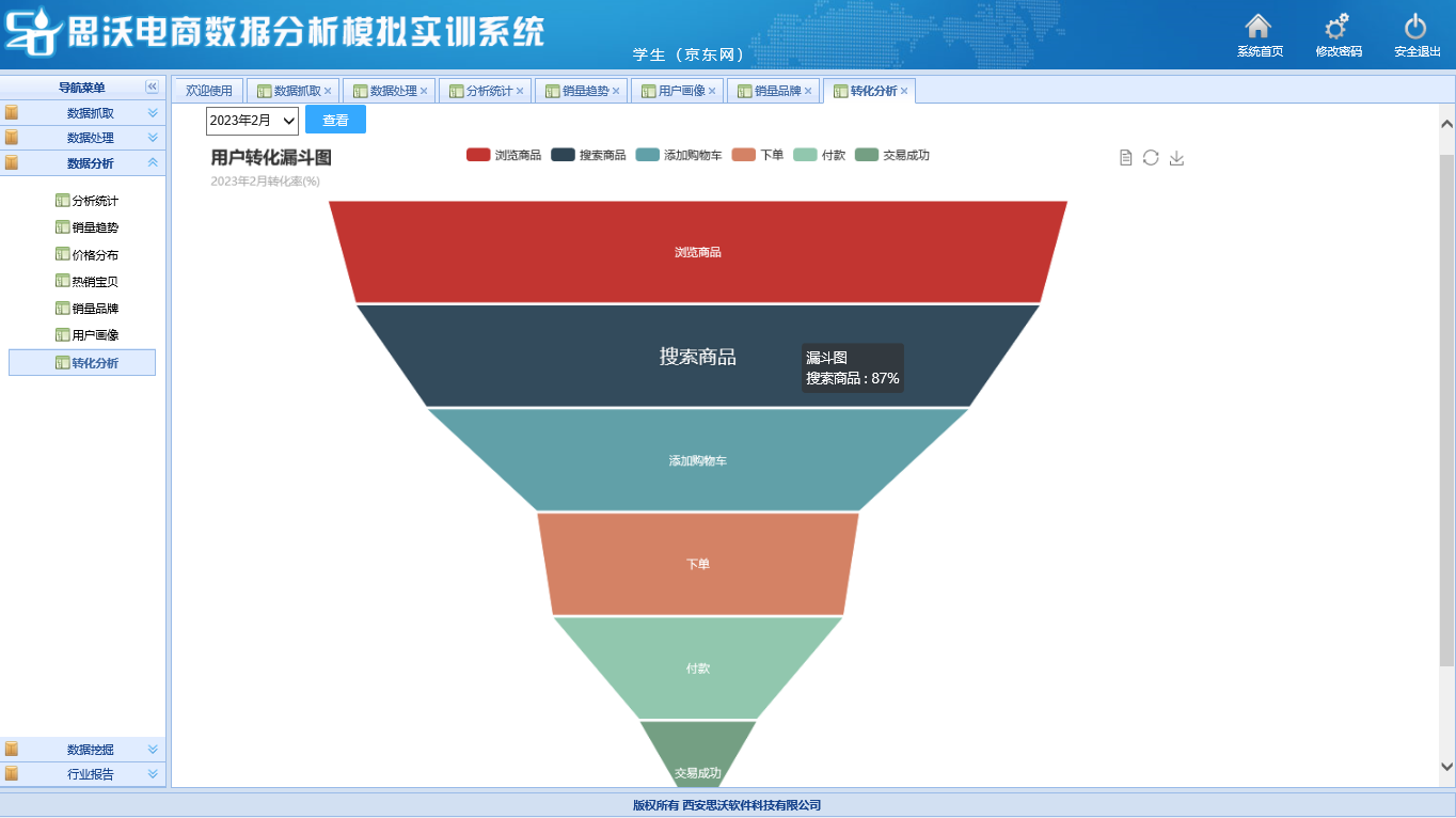 當(dang)前大數(shu)(shu)(shu)(shu)據(ju)(ju)(ju)和(he)(he)數(shu)(shu)(shu)(shu)據(ju)(ju)(ju)化(hua)運營(ying)的(de)(de)概念早已(yi)深(shen)入人心,數(shu)(shu)(shu)(shu)據(ju)(ju)(ju)分(fen)(fen)(fen)(fen)析(xi)(xi)已(yi)經(jing)成為電(dian)(dian)商(shang)(shang)從業人員不可(ke)(ke)或缺的(de)(de)一項(xiang)技(ji)能。《思(si)(si)沃電(dian)(dian)商(shang)(shang)數(shu)(shu)(shu)(shu)據(ju)(ju)(ju)分(fen)(fen)(fen)(fen)析(xi)(xi)模擬實(shi)訓(xun)系統(tong)》就是(shi)根據(ju)(ju)(ju)當(dang)前電(dian)(dian)子商(shang)(shang)務行(xing)(xing)業發展,通過(guo)真(zhen)實(shi)模擬電(dian)(dian)商(shang)(shang)運營(ying)平臺(tai)環境,幫助(zhu)學(xue)(xue)生掌握電(dian)(dian)商(shang)(shang)數(shu)(shu)(shu)(shu)據(ju)(ju)(ju)分(fen)(fen)(fen)(fen)析(xi)(xi)技(ji)能的(de)(de)教學(xue)(xue)平臺(tai)軟件(jian)(jian)。隨著(zhu)市場規模的(de)(de)普遍增(zeng)加和(he)(he)業務規模的(de)(de)快速(su)增(zeng)長,電(dian)(dian)商(shang)(shang)業務流(liu)程(cheng)開始變得(de)復雜, 涉及(ji)的(de)(de)交易數(shu)(shu)(shu)(shu)據(ju)(ju)(ju)量(liang)(liang)將(jiang)繼續增(zeng)加。為了在激烈(lie)的(de)(de)市場競(jing)(jing)爭(zheng)(zheng)中脫穎而出,許多電(dian)(dian)商(shang)(shang)公(gong)司都會(hui)設立專門的(de)(de)崗位和(he)(he)人員,及(ji)時了解(jie)(jie)廣告、產品(pin)價格(ge)和(he)(he)銷(xiao)售數(shu)(shu)(shu)(shu)據(ju)(ju)(ju),并根據(ju)(ju)(ju)競(jing)(jing)爭(zheng)(zheng)產品(pin) 的(de)(de)產品(pin)和(he)(he)營(ying)銷(xiao)策(ce)略進(jin)行(xing)(xing)調(diao)整。隨著(zhu)電(dian)(dian)商(shang)(shang)領域(yu)穩步(bu)增(zeng)長,競(jing)(jing)爭(zheng)(zheng)日(ri)益激烈(lie),渠道精細化(hua)運營(ying)已(yi)然(ran)成為品(pin)牌突圍的(de)(de)重(zhong)中之重(zhong)。 數(shu)(shu)(shu)(shu)據(ju)(ju)(ju)(和(he)(he)數(shu)(shu)(shu)(shu)據(ju)(ju)(ju)分(fen)(fen)(fen)(fen)析(xi)(xi))對電(dian)(dian)商(shang)(shang)至(zhi)關重(zhong)要,通過(guo)海量(liang)(liang)數(shu)(shu)(shu)(shu)據(ju)(ju)(ju),店鋪(pu)運營(ying)人員可(ke)(ke)以(yi)了解(jie)(jie)客戶的(de)(de)行(xing)(xing)為和(he)(he)偏好,也可(ke)(ke)以(yi)洞察同行(xing)(xing)業競(jing)(jing)爭(zheng)(zheng)對手(shou)的(de)(de)方(fang)向和(he)(he)動態(tai),這就是(shi)了解(jie)(jie)自己、了解(jie)(jie)競(jing)(jing)爭(zheng)(zheng)對手(shou)。 《思(si)(si)沃電(dian)(dian)商(shang)(shang)數(shu)(shu)(shu)(shu)據(ju)(ju)(ju)分(fen)(fen)(fen)(fen)析(xi)(xi)模擬實(shi)訓(xun)系統(tong)》高度模擬京東網,真(zhen)實(shi)獲取海量(liang)(liang)京東真(zhen)實(shi)數(shu)(shu)(shu)(shu)據(ju)(ju)(ju),該教學(xue)(xue)軟件(jian)(jian)系統(tong)的(de)(de)從京東的(de)(de)各(ge)行(xing)(xing)業數(shu)(shu)(shu)(shu)據(ju)(ju)(ju)分(fen)(fen)(fen)(fen)析(xi)(xi)入手(shou),系統(tong)展示在電(dian)(dian)子商(shang)(shang)務環境下進(jin)行(xing)(xing)運營(ying)數(shu)(shu)(shu)(shu)據(ju)(ju)(ju)分(fen)(fen)(fen)(fen)析(xi)(xi)的(de)(de)各(ge)種(zhong)思(si)(si)路和(he)(he)方(fang)法。 能讓學(xue)(xue)生快速(su)學(xue)(xue)會(hui)如何做電(dian)(dian)商(shang)(shang)數(shu)(shu)(shu)(shu)據(ju)(ju)(ju)分(fen)(fen)(fen)(fen)析(xi)(xi),并能利用數(shu)(shu)(shu)(shu)據(ju)(ju)(ju)分(fen)(fen)(fen)(fen)析(xi)(xi)結果指導網店經(jing)營(ying)。