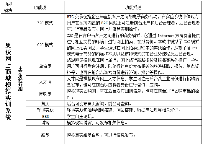 思沃網(wang)上商(shang)城(cheng)(cheng)模擬實(shi)(shi)(shi)訓(xun)系(xi)統(tong)充分考慮到(dao)了試驗的(de)具體情況,系(xi)統(tong)針(zhen)對(dui)網(wang)上商(shang)城(cheng)(cheng)模擬實(shi)(shi)(shi)訓(xun)進(jin)行相關(guan)配置(zhi),學生(sheng)可在(zai)(zai)系(xi)統(tong)中體驗網(wang)上B2C、C2C模擬商(shang)城(cheng)(cheng)開店實(shi)(shi)(shi)訓(xun)并結合網(wang)絡環境的(de)搭建、數(shu)據庫運用知識、團(tuan)購(gou)網(wang)、在(zai)(zai)線旅(lv)游網(wang)、在(zai)(zai)線人才網(wang)等進(jin)行多元性的(de)實(shi)(shi)(shi)訓(xun)系(xi)統(tong)。