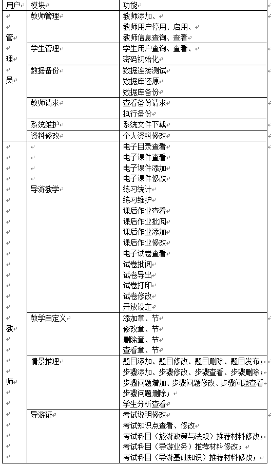 系(xi)統采用(yong)管理(li)員—教師—學生的用(yong)戶管理(li)模式,由三種(zhong)權(quan)限用(yong)戶,各(ge)權(quan)限用(yong)戶功能不同。