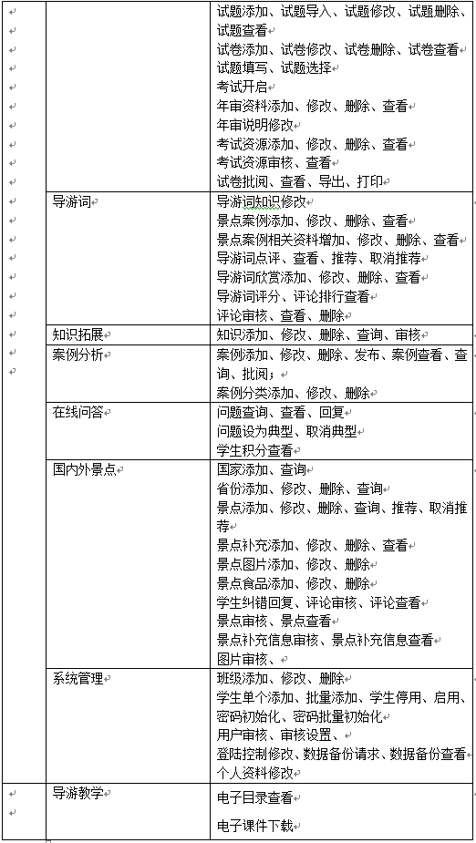 教(jiao)師主(zhu)要功能包括(kuo)班級學生管(guan)理(li)(li)(li)、導游基礎知識(shi)管(guan)理(li)(li)(li)、國(guo)(guo)內導游知識(shi)管(guan)理(li)(li)(li)、國(guo)(guo)外導游知識(shi)管(guan)理(li)(li)(li)、情景題目(mu)管(guan)理(li)(li)(li)、導游證考(kao)試資(zi)料(liao)管(guan)理(li)(li)(li)、模擬考(kao)試、導游詞管(guan)理(li)(li)(li)、導游案(an)例(li)管(guan)理(li)(li)(li)、知識(shi)拓展、案(an)例(li)分析管(guan)理(li)(li)(li)、在線問(wen)答、國(guo)(guo)內外景點信息管(guan)理(li)(li)(li)等。