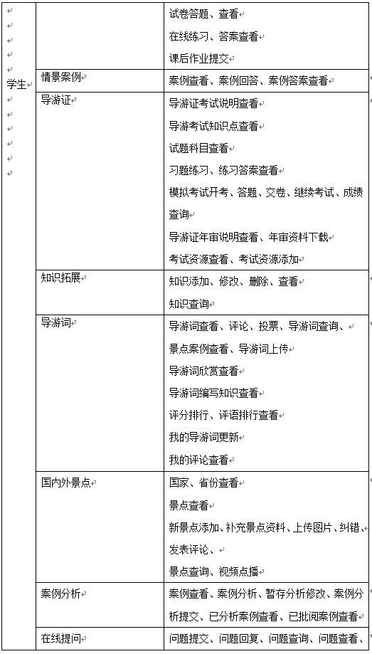 學(xue)(xue)(xue)生(sheng)的(de)主要功能是導(dao)游教學(xue)(xue)(xue)知(zhi)識(shi)的(de)學(xue)(xue)(xue)習、完(wan)成情景推理(li)中包(bao)含的(de)案例(li)及(ji)題(ti)目(mu)、導(dao)游證(zheng)考(kao)試學(xue)(xue)(xue)習及(ji)模擬考(kao)試、導(dao)游拓展(zhan)知(zhi)識(shi)學(xue)(xue)(xue)習,同時(shi)可添加(jia)新(xin)的(de)知(zhi)識(shi)供其他同學(xue)(xue)(xue)學(xue)(xue)(xue)習、導(dao)游詞學(xue)(xue)(xue)習并(bing)編寫導(dao)游詞、國內(nei)外景點學(xue)(xue)(xue)習、案例(li)分析和在線提問。