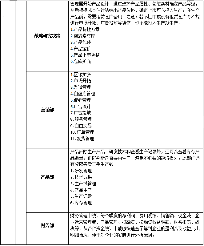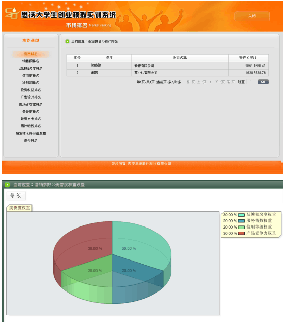 5、系統具有(you)自(zi)動計(ji)分和手(shou)動評(ping)分功能。自(zi)動計(ji)分以各方面排(pai)(pai)(pai)(pai)名(ming)的形式(shi),包括資(zi)金排(pai)(pai)(pai)(pai)名(ming)、銷售排(pai)(pai)(pai)(pai)名(ming)、知(zhi)名(ming)度(du)排(pai)(pai)(pai)(pai)名(ming)、利潤排(pai)(pai)(pai)(pai)名(ming)、投資(zi)收益排(pai)(pai)(pai)(pai)名(ming)、廣(guang)告(gao)設計(ji)排(pai)(pai)(pai)(pai)名(ming)、市場占有(you)率排(pai)(pai)(pai)(pai)名(ming)、美(mei)譽度(du)排(pai)(pai)(pai)(pai)名(ming)、投融資(zi)收益排(pai)(pai)(pai)(pai)名(ming)、累計(ji)繳稅排(pai)(pai)(pai)(pai)名(ming)、綜合(he)排(pai)(pai)(pai)(pai)名(ming)等。教(jiao)師可以批閱(yue)學生所(suo)提交的計(ji)劃書、廣(guang)告(gao)設計(ji)、市場調查分析、公(gong)司制度(du)等。
