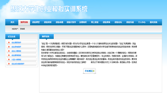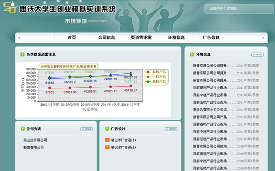 思沃大學(xue)生(sheng)(sheng)創(chuang)(chuang)(chuang)(chuang)(chuang)(chuang)業(ye)(ye)模(mo)(mo)(mo)擬(ni)(ni)實(shi)(shi)訓平臺系(xi)(xi)統(tong)從大學(xue)生(sheng)(sheng)創(chuang)(chuang)(chuang)(chuang)(chuang)(chuang)業(ye)(ye)的(de)(de)現狀分(fen)(fen)析,將(jiang)創(chuang)(chuang)(chuang)(chuang)(chuang)(chuang)業(ye)(ye)教(jiao)育的(de)(de)內(nei)(nei)容(rong)以及因素(su)滲透在專業(ye)(ye)實(shi)(shi)踐教(jiao)學(xue)中(zhong),并(bing)根據創(chuang)(chuang)(chuang)(chuang)(chuang)(chuang)業(ye)(ye)教(jiao)育的(de)(de)目標及內(nei)(nei)容(rong)設置較完善的(de)(de)創(chuang)(chuang)(chuang)(chuang)(chuang)(chuang)業(ye)(ye)實(shi)(shi)踐體系(xi)(xi)。軟(ruan)件模(mo)(mo)(mo)擬(ni)(ni)交互(hu)思想,采用國際先進(jin)的(de)(de)計算機仿(fang)(fang)真技術,仿(fang)(fang)真模(mo)(mo)(mo)擬(ni)(ni)虛(xu)擬(ni)(ni)市(shi)(shi)場(chang)環境、市(shi)(shi)場(chang)調查以及整(zheng)個市(shi)(shi)場(chang)競爭結構。學(xue)生(sheng)(sheng)通(tong)過(guo)軟(ruan)件學(xue)習創(chuang)(chuang)(chuang)(chuang)(chuang)(chuang)業(ye)(ye)心(xin)理(li)學(xue)、創(chuang)(chuang)(chuang)(chuang)(chuang)(chuang)業(ye)(ye)講堂、網上創(chuang)(chuang)(chuang)(chuang)(chuang)(chuang)業(ye)(ye)、創(chuang)(chuang)(chuang)(chuang)(chuang)(chuang)業(ye)(ye)準備等創(chuang)(chuang)(chuang)(chuang)(chuang)(chuang)業(ye)(ye)知識(shi)(shi),撰寫一份創(chuang)(chuang)(chuang)(chuang)(chuang)(chuang)業(ye)(ye)計劃書,投入到(dao)創(chuang)(chuang)(chuang)(chuang)(chuang)(chuang)業(ye)(ye)實(shi)(shi)戰中(zhong)。創(chuang)(chuang)(chuang)(chuang)(chuang)(chuang)業(ye)(ye)實(shi)(shi)戰分(fen)(fen)為公(gong)司(si)注(zhu)冊(ce)和實(shi)(shi)戰運(yun)營(ying)(ying)。公(gong)司(si)注(zhu)冊(ce)采用Flash動畫(hua)模(mo)(mo)(mo)式,模(mo)(mo)(mo)擬(ni)(ni)公(gong)司(si)注(zhu)冊(ce)的(de)(de)整(zheng)個流程(cheng)。實(shi)(shi)戰運(yun)營(ying)(ying)是整(zheng)個系(xi)(xi)統(tong)的(de)(de)主(zhu)體,將(jiang)全(quan)國分(fen)(fen)為七(qi)個區(qu)(qu)(qu)域(yu):東北(bei)地(di)(di)區(qu)(qu)(qu)、華(hua)北(bei)地(di)(di)區(qu)(qu)(qu)、西北(bei)地(di)(di)區(qu)(qu)(qu)、華(hua)東地(di)(di)區(qu)(qu)(qu)、西南(nan)地(di)(di)區(qu)(qu)(qu)、華(hua)中(zhong)地(di)(di)區(qu)(qu)(qu)、華(hua)南(nan)地(di)(di)區(qu)(qu)(qu)。系(xi)(xi)統(tong)模(mo)(mo)(mo)擬(ni)(ni)公(gong)司(si)內(nei)(nei)部與(yu)(yu)外(wai)在市(shi)(shi)場(chang)之間的(de)(de)矛盾,創(chuang)(chuang)(chuang)(chuang)(chuang)(chuang)業(ye)(ye)者通(tong)過(guo)各種調查、決(jue)策解決(jue)企業(ye)(ye)市(shi)(shi)場(chang)運(yun)營(ying)(ying)過(guo)程(cheng)中(zhong)可能遇(yu)到(dao)的(de)(de)各種情況。在區(qu)(qu)(qu)域(yu)需求飽和后擴大市(shi)(shi)場(chang),對其中(zhong)出現的(de)(de)問題和運(yun)營(ying)(ying)結果進(jin)行分(fen)(fen)析與(yu)(yu)評估,培養大學(xue)生(sheng)(sheng)正確的(de)(de)人生(sheng)(sheng)觀、價值觀、就業(ye)(ye)觀,提高大學(xue)生(sheng)(sheng)勇于(yu)創(chuang)(chuang)(chuang)(chuang)(chuang)(chuang)業(ye)(ye)的(de)(de)精神,讓大學(xue)生(sheng)(sheng)有良好的(de)(de)創(chuang)(chuang)(chuang)(chuang)(chuang)(chuang)業(ye)(ye)意識(shi)(shi),增強大學(xue)生(sheng)(sheng)自主(zhu)創(chuang)(chuang)(chuang)(chuang)(chuang)(chuang)業(ye)(ye)能力。